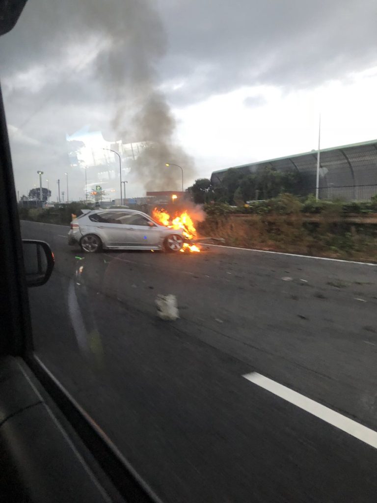 事故の衝撃で乗用車のフロント部分から出火し車両火災が発生している模様。