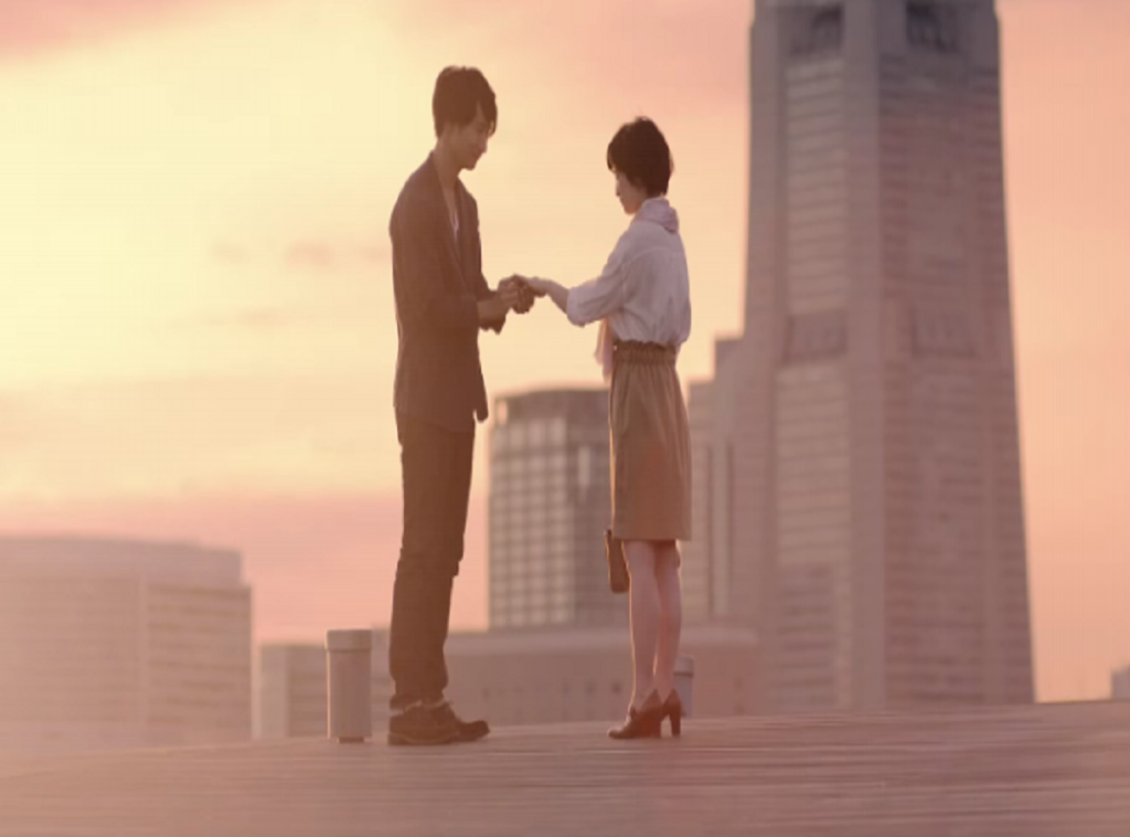 横浜でのデートの終わりにプロポーズするというシチュエーション。緊張の面持ちでプロポーズに臨む男性、顔をくしゃくしゃにしながら喜ぶ女性、2人のリアルな表情がとても印象的なCMです。