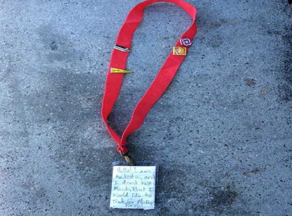 「こんにちは。私は自閉症で、あまりたくさん喋る事ができません。でも私は、ミッキーのピンバッチを交換したいです」