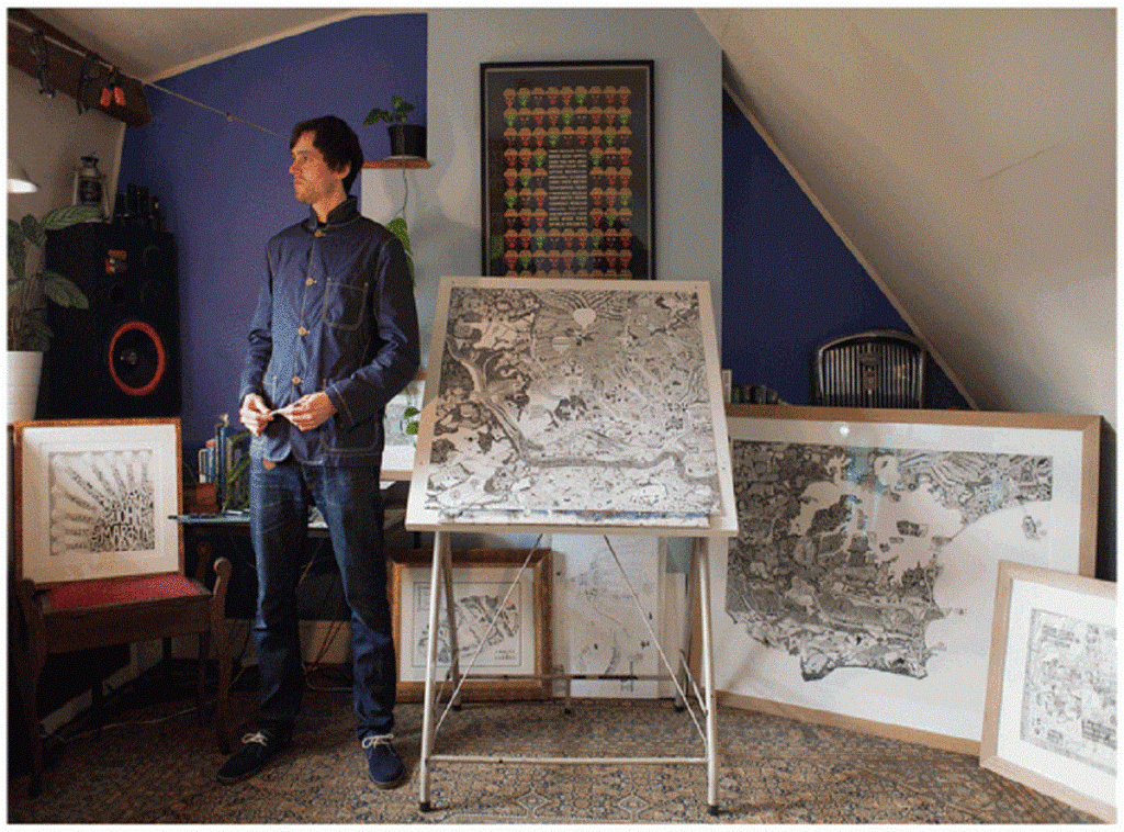 黒ペンのみで綿密な表現の絵を描く作風で、ロンドンの街やブリストル、パーベックなどイギリスの都市の地図をユーモアを交えて描いています。