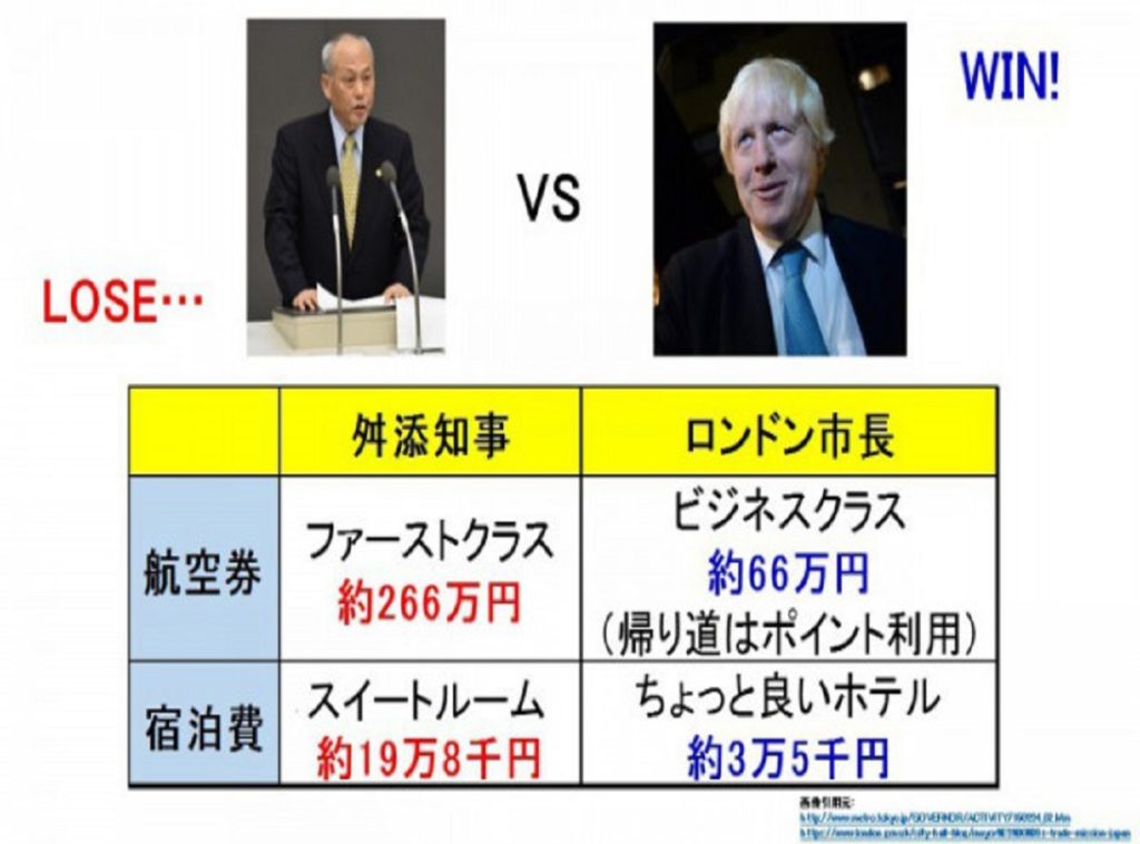 航空運賃は約4倍の差がついてます。舛添知事のファーストクラス分で、ロンドン市長一行分のほとんどをカバーできちゃいますね。