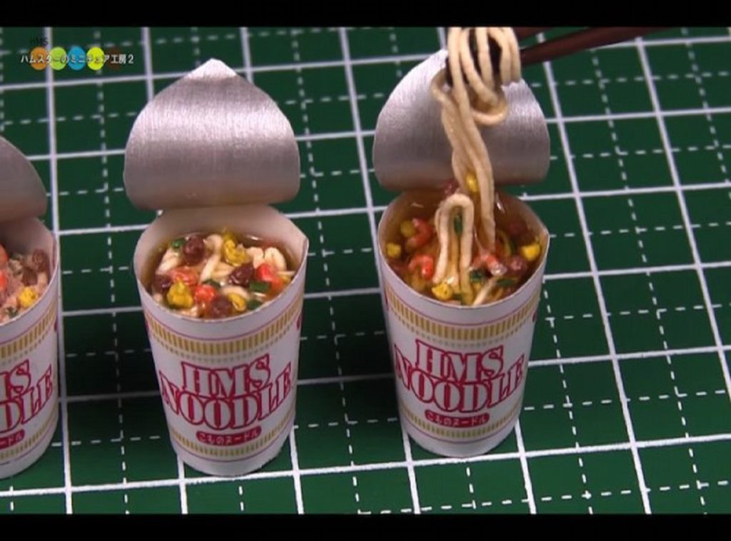 容器、麺、具材、スープ。すべてに至までミニチュアでDIYされたカップヌードル。もうね、ほんとすごいね。いろんな人に見て欲しい。この作品は、世界に羽ばたいて伝わって欲しい。それぐらい凄い。ホント凄いんだ。
