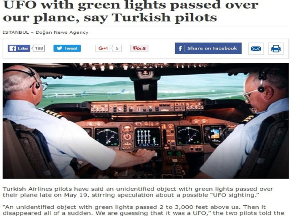 19日深夜、業界のタブーを破ってトルコ航空機の操縦士2名が当局に「UFOとの遭遇」を報告していたことを同国最大手のニュースメディア『hurriyetdailynews.com』が伝え、それとの関連性はないものかと波紋を広げている。
