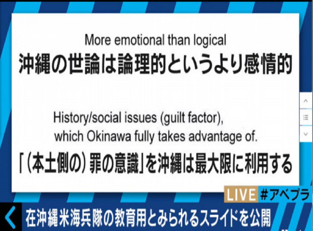 5月30日、在沖縄米海兵隊の教育用と見られるスライドが公開されたことが報じられ、その内容に波紋が集まっている。
