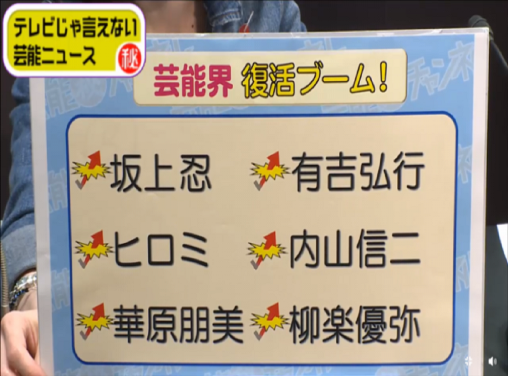 駒井氏が名を挙げたのは、坂上忍、有吉弘行、ヒロミ、内山信二、華原朋美、柳楽優弥ら。