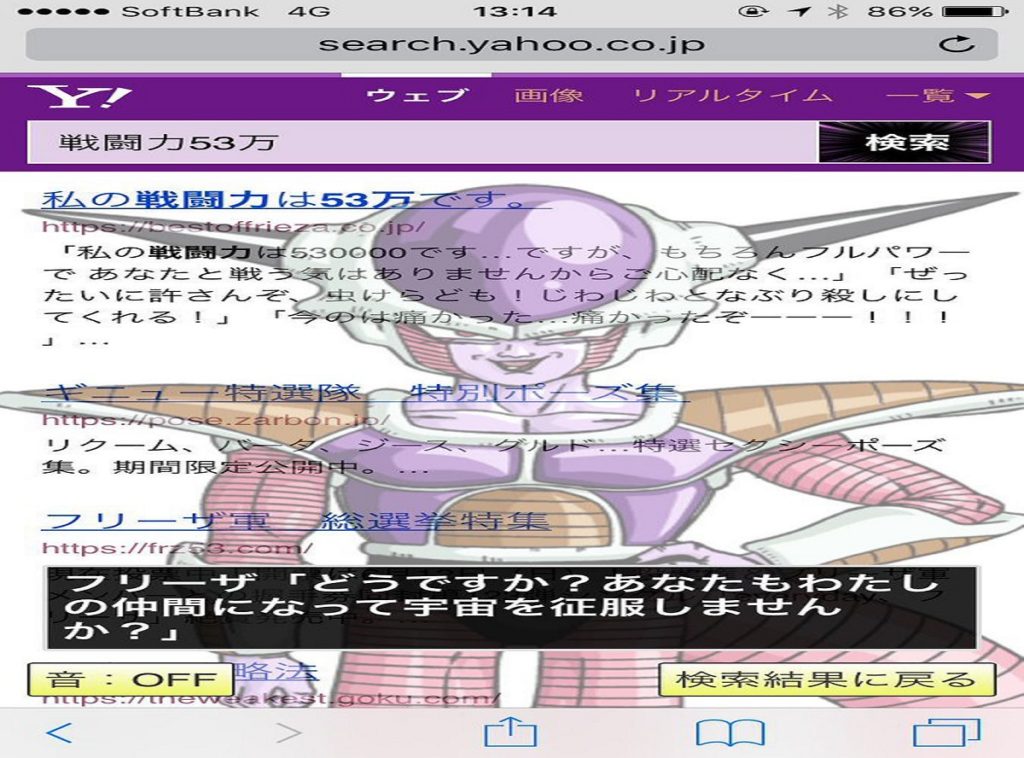 この「戦闘力53万」を、スマホ版ヤフー検索で調べてほしい。するとどうだろう……フリーザ様が登場し、スマホを乗っ取ったではないか! しかも「仲間にならないか?」と直々に勧誘してくるから、胸アツ以外の何物でもない。