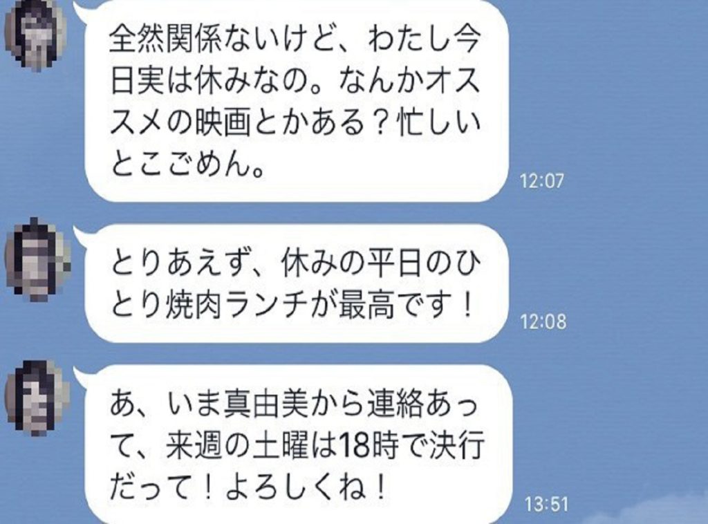 スケジュールに関するやり取りをしながらも、途中に女性がそれとは関係のない内容のメッセージを2通入れ、最後に本題であるスケジュールの決定事項について送っています。
