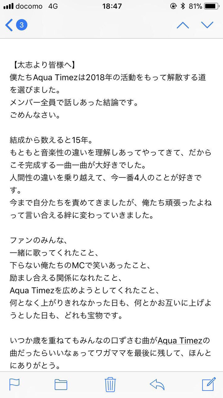 悲劇, 驚き 【悲報】Aqua Timez解散 naitter 2018年5月8日 Tweet スポンサードリンク 引用元: http://hawk.5ch.net/test/read.cgi/livejupiter/1525773959/ Related Posts どっちが悪い?白バイとトラックの接触事故が物議を醸す! 線からはみ出して駐車していた車がいたので懲らしめてやった! 【ポケモンGO速報】ヒノアラシコミュニティデイでネットワークエラー多発!ヒノアラシコミュニティデイは案… 【金スマにベッキー出演】スポンサー「スポンサーを降りる考えはありません」不倫騒動で休養していたタレント… ひき逃げ、飲酒運転の疑いで吉澤ひとみ容疑者逮捕東京都内でひき逃げをしたとして… ← 前田裕二 彼女は石原さとみ!SHOWROOM社長との馴れ初めは? 岡本圭人[Hey!Say!JUMP]温泉地キャバクラで乱痴気騒動 →